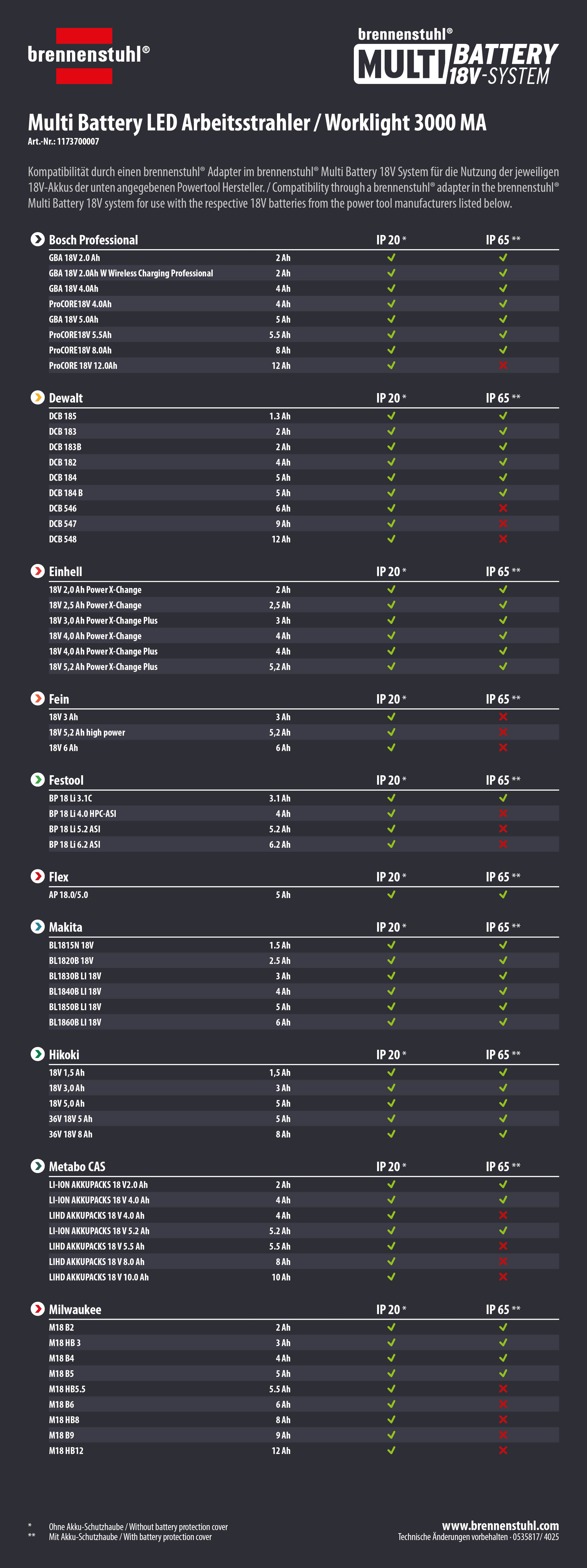 Welche Akkus sind mit dem brennenstuhl® Multi Battery LED Arbeitsstrahler 3000 MA kompatibel? 17. Oktober 2025 12:29 Aktualisiert 0535817 Multi-Battery_Akku-System_Compatibility_3000 MA_x4.pdf 600 kB Herunterladen Verwandte Beiträge Was kann ich tun, wenn es für mein akkubetriebenes Produkt keinen Ersatzakku mehr gibt? Wann muss ich bei dem Batterie LED Strahler LUFOS die Batterien wechseln? Welche Akkus sind mit dem brennenstuhl® Multi Battery LED Teleskop Arbeitsstrahler 6050 MA kompatibel? Warum kann ich meinen RUFUS Arbeitsstrahler nicht während dem Laden verwenden? Welche Akkus sind mit dem brennenstuhl® Multi Battery LED Arbeitsstrahler 10050 MH / 10052 MH kompatibel?
