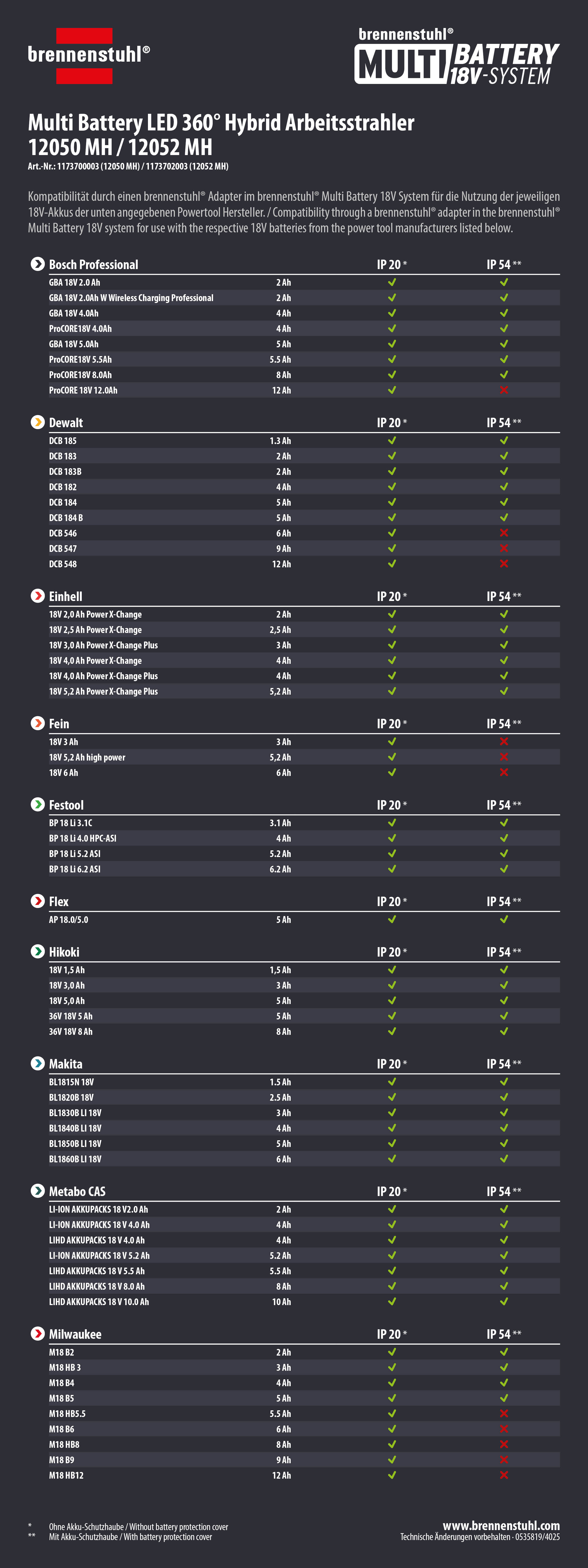 Which batteries are compatible with the brennenstuhl® Multi Battery LED Worklight 12050 MH / 12052 MH? October 17, 2025 12:26 Updated 0535819 Multi-Battery_Akku-System_Compatibility_12050 MH_x4.pdf 600 KB Download Related articles Which batteries are compatible with the brennenstuhl® Multi Battery LED Telescopic Worklight 6050 MA? Accepted Payment Methods in the Online Shop Can I program in the brennenstuhl®Connect app that several brennenstuhl®Connect WiFi LED spotlights light up when one detects movement? How can I teach in my brennenstuhl®Connect device with the AP mode? What can I do if the brennenstuhl®Connect WiFi Smoke and Heat Alarm WRHM01 shows the old status after changing the battery?