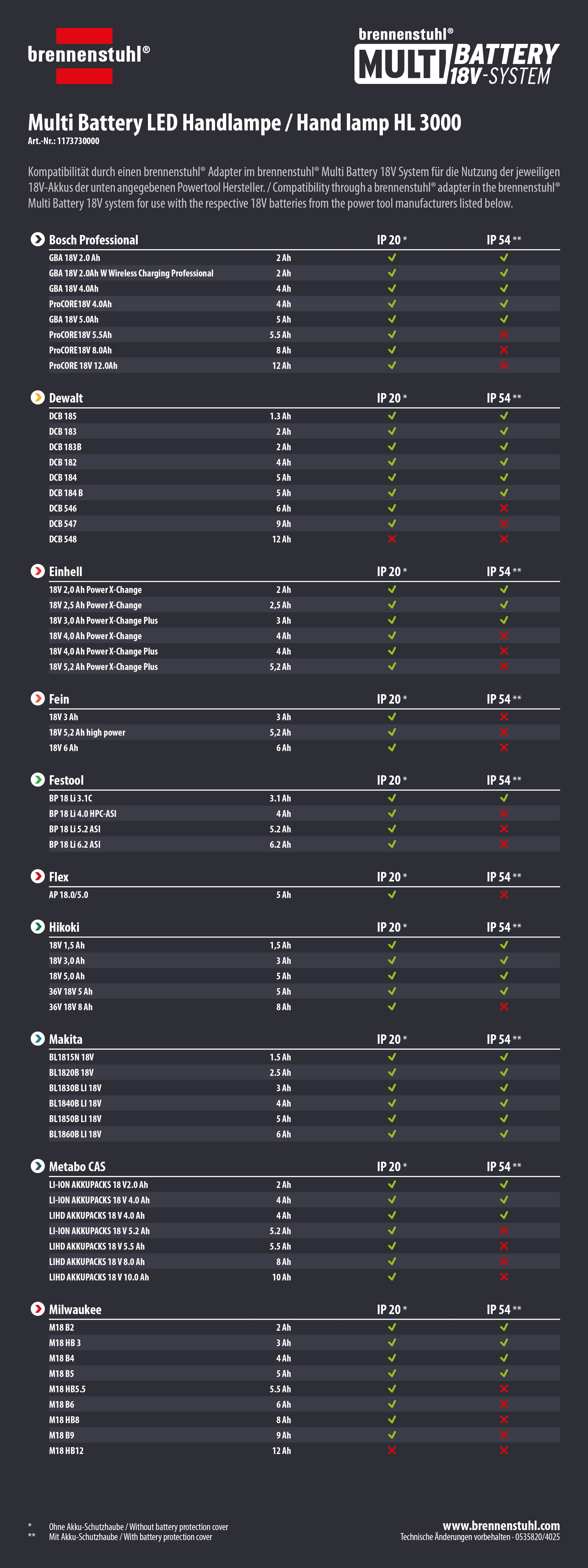 Quelles batteries sont compatibles avec la lampe à main LED brennenstuhl® Multi Battery HL 3000 ? 17 octobre 2025 12:33 Mise à jour 0535820 Multi-Battery_Akku-System_Compatibility_HL 3000_x4.pdf 600 ko Télécharger Articles associés Quelles batteries sont compatibles avec le projecteur de travail brennenstuhl® Multi Battery LED 4000 MA ? Quels adaptateurs sont fournis avec les projecteurs de travail brennenstuhl® Multi Battery ? Quelles batteries sont compatibles avec le Brennenstuhl® Multi Battery LED Teleskop Arbeitsstrahler 6050 MA ? Comment obtenir une pièce de rechange d'un produit brennenstuhl® ? Quand la garantie expire-t-elle ?
